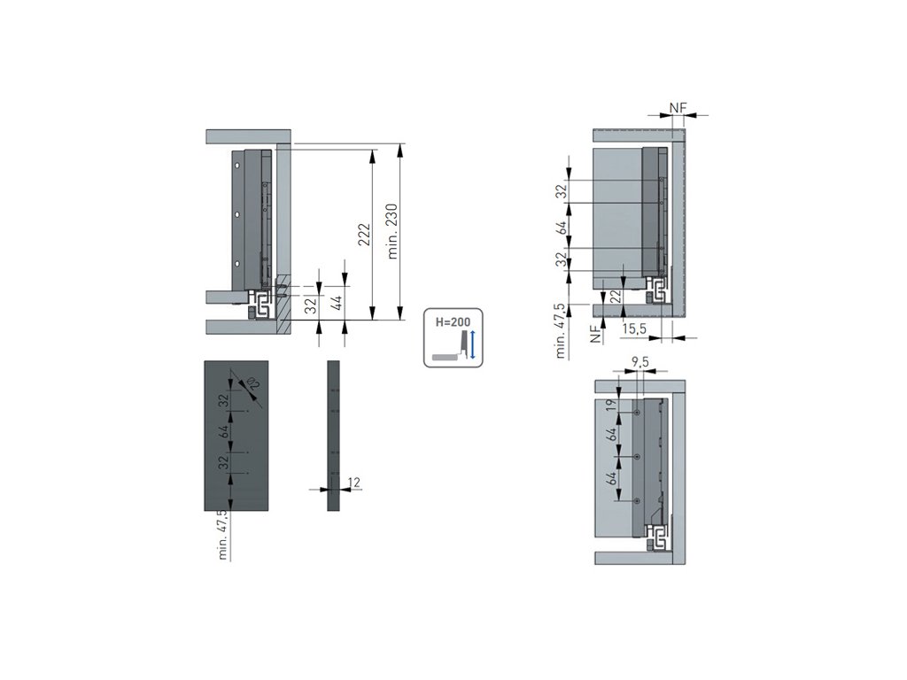 Hrúbka bočnice: 14 mm Výška bočnice: 200 mm Výška zásuvky / minimálna konštrukčná výška: 222 / 230 mm Pre hĺbku zásuvky 300 mm Skrytý plnovýsuv Nosnosť: 40 kg Materiál: oceľ Farba: biela